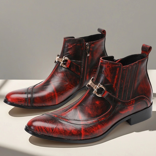 Ανδρικά κόκκινα μποτάκια μοναχικού ιμάντα από γνήσιο δέρμα, με γυαλιστερό φινίρισμα και λεπτομέρεια με αγκράφα, δερμάτινες μπότες για πάρτι, συναυλίες και εκδηλώσεις μόδας #10938126
