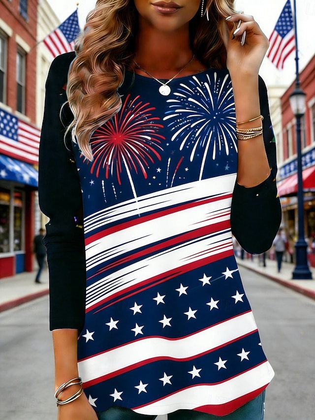 Ημέρα Αμερικανικής Ανεξαρτησίας Γυναικεία Μπλουζάκι Μπλουζάκι μπλουζάκι Στάμπα Γραφική Αμερικάνικη σημαία Μοντέρνα Στυλάτο Κλασσικό Μακρυμάνικο Στρογγυλή Ψηλή Λαιμόκοψη Κανονικά μπλουζάκια #10977264