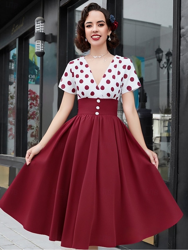 Ρετρό vintage 1950 στολές Grease rockabilly midi φόρεμα swing dress φούστα flare high waist πολka dots A-line deep V fancy dress γυναικείο καρναβάλι νέα χρονιά tea party καθημερινά ρούχα#11053297