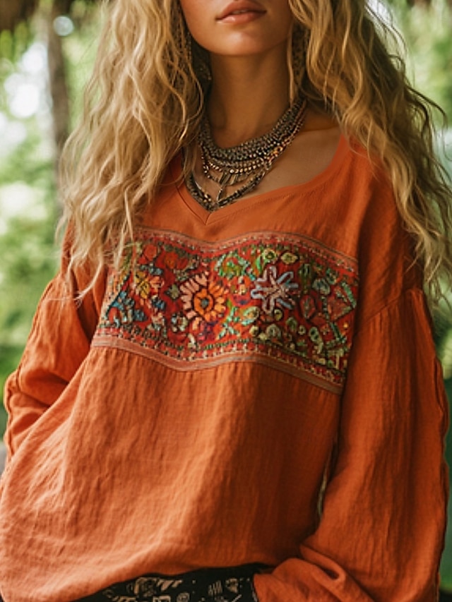 γυναικεία μπλούζα western μπλούζα boho πουκάμισο μπλούζα faux βαμβάκι λινό λουλούδι μοντέρνο casual μακρυμάνικο λαιμόκοψη V κανονικό τοπ καθημερινά αργία έξοδος print μαύρο φούξια πορτοκαλί βερίκοκο γκρι καλοκαίρι φθινόπωρο #11567689