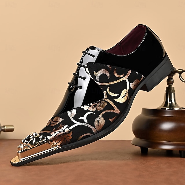 Ανδρικά μαύρα φλοράλ παπούτσια με μυτερή μύτη και μεταλλικό καπάκι στην μύτη, μοντέρνα επίσημα παπούτσια με κορδόνια για κομψούς άνδρες, ιδανικά για γάμους, πάρτι, δεξιώσεις και θεατρικές παραστάσεις.#12200576