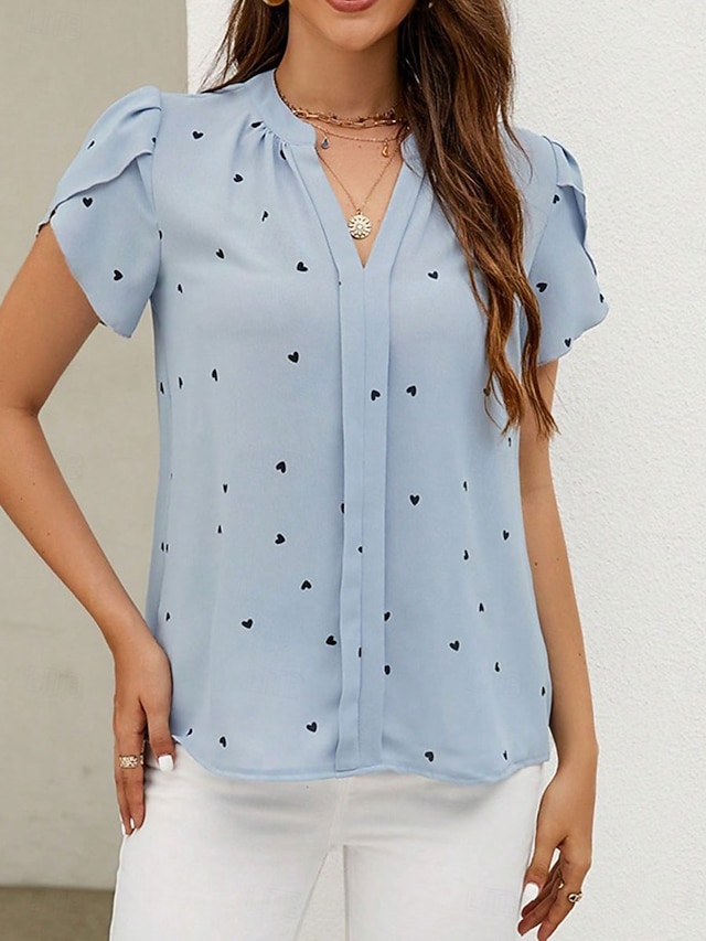 Γυναικεία Πουκάμισο Μπλούζα Στάμπα Καρδιά Κομψό Καθημερινά Στυλάτο Κοντομάνικο Λαιμόκοψη V Κανονικά μπλουζάκια Καθημερινά Δουλειά Αργίες Μαύρο Ανθισμένο Ροζ Μπεζ Μπλε Απαλό Καλοκαίρι Άνοιξη #12654914