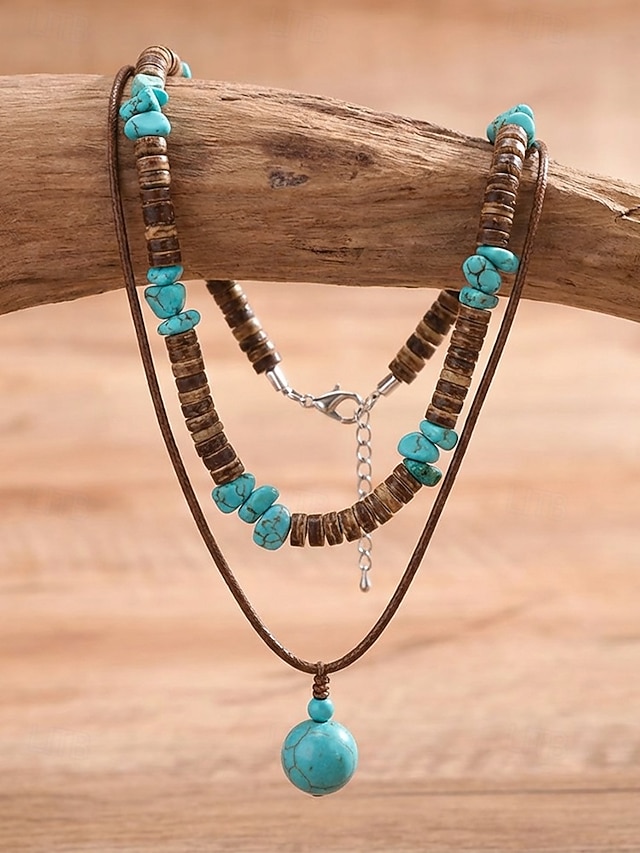 Ανδρικό κολιέ μποέμ με κέλυφος καρύδας και τυρκουάζ, μπλε και καφέ κολιέ με χάντρες σε στρώσεις για διακοπές στην παραλία, ρούχα σε θέρετρα, casual καλοκαιρινά ρούχα και καθημερινή χρήση #13789520
