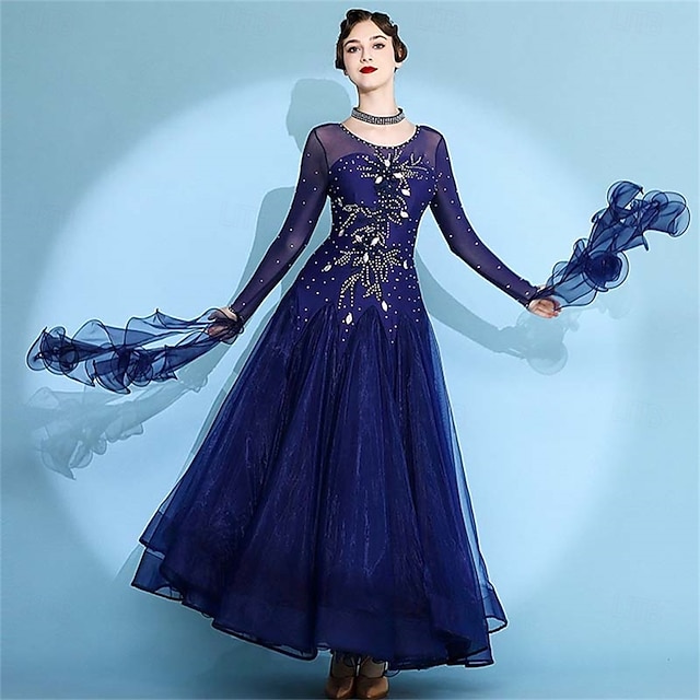 Γυναικείο φόρεμα χορού με ασύμμετρους ώμους, στρας, κομψό φόρεμα για τάνγκο, βαλς, φοξτροτ, αγωνιστική παράσταση – μπλε σκούρο