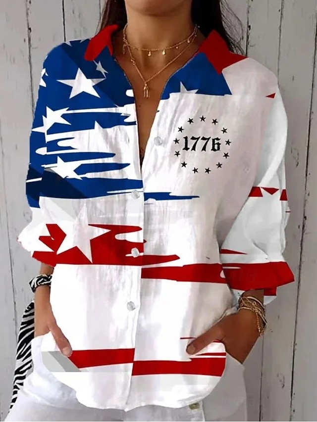 Ημέρα Αμερικανικής Ανεξαρτησίας Γυναικεία Πουκάμισο Σουρωτά Κουρελού Κουμπιά Γραφική Σημαία Βίντατζ Στυλάτο Μακρυμάνικο Ριχτά μανίκια Καμπάνα Κολάρο Πουκαμίσου Κανονικά μπλουζάκια #15794371