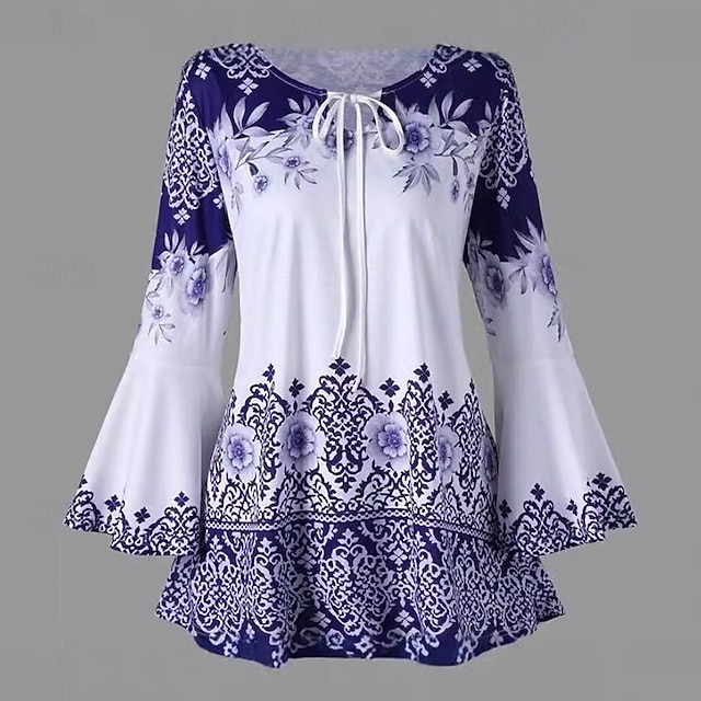 Γυναικεία Μπλούζα Στάμπα Γραφική Βίντατζ Καθημερινά Στυλάτο Μακρυμάνικο Καμπάνα Στρογγυλή Ψηλή Λαιμόκοψη Κανονικά μπλουζάκια Καθημερινά Αργίες Εξόδου Θαλασσί Μαύρο Καλοκαίρι Άνοιξη #15842257