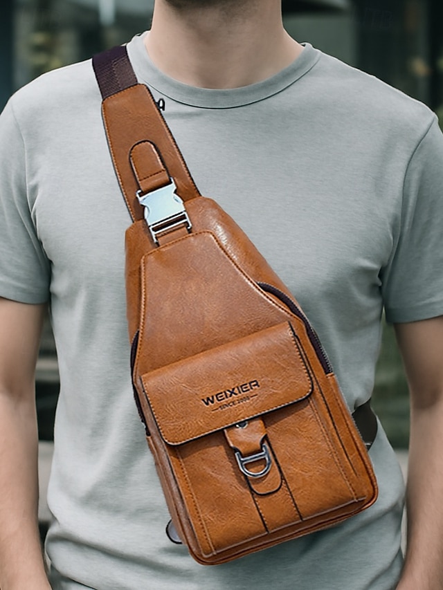 Ανδρική καφέ τσάντα χιαστί από τεχνητό δέρμα - αδιάβροχη και ανθεκτική στις γρατσουνιές τσάντα στήθους με ρυθμιζόμενο ιμάντα ώμου για ταξίδια, εργασία ή καθημερινή χρήση σε πάρτι #16000566