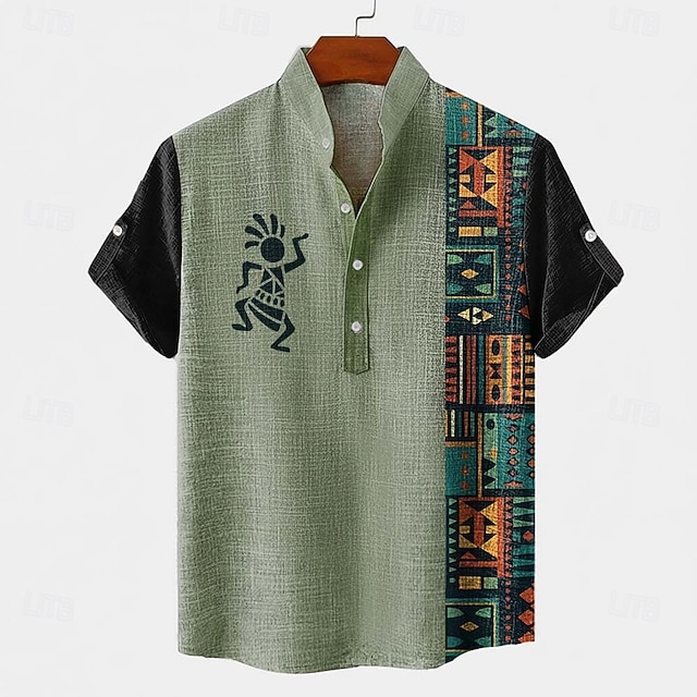 Ανδρικά Γεωμετρικά σχήματα Etnic Κοκοπέλλι Πουκάμισο Πουκάμισο με κουμπιά Κοντομάνικο Vintage ρετρό Αργίες Καθημερινά Καλοκαίρι Άνοιξη Όρθιος γιακάς Henley Collar 3D εκτύπωση Λινό σαν πουκάμισο Kaki #16019935