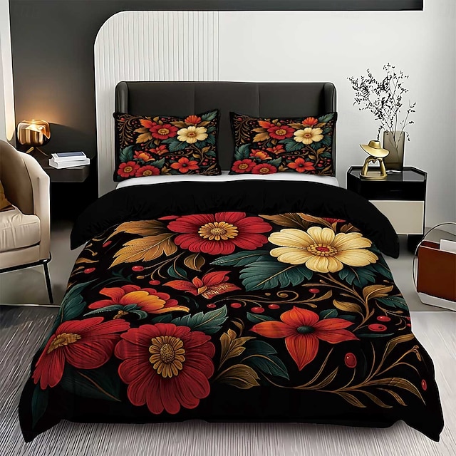 Σετ παπλωματοθήκης 3 τεμαχίων με ρετρό τρισδιάστατη εκτύπωση λουλουδιών από πούπουλα για κρεβάτι queen size, μαλακό κοντό βελούδινο κάλυμμα παπλώματος με 2 μαξιλαροθήκες - κλινοσκεπάσματα υπνοδωματίου#16236955