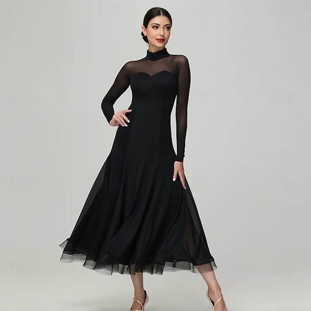 Γυναικείο φόρεμα χορού ballroom με βελούδινο πλέγμα, μακρυμάνικο βαλς, τάνγκο, λάτιν φόρεμα διαγωνισμού, κομψό μαύρο