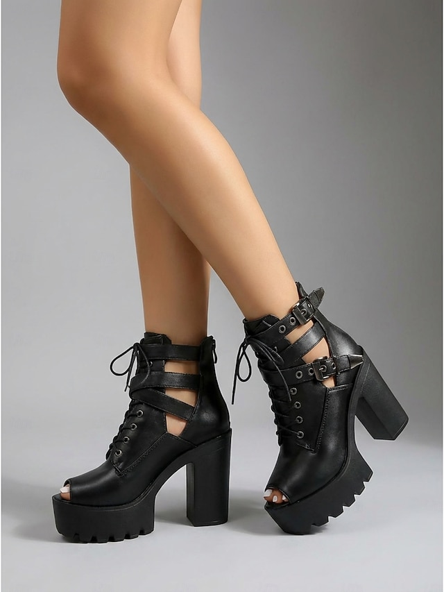 Γυναικεία μαύρα μποτάκια με πλατφόρμα για φεστιβάλ - τολμηρά, χοντρά τακούνια με ανοιχτή μύτη, κορδόνια και λουράκια με αγκράφα &σόλα με λοβό για μουσικά φεστιβάλ, συναυλίες &ρέιβ πάρτι #17433162