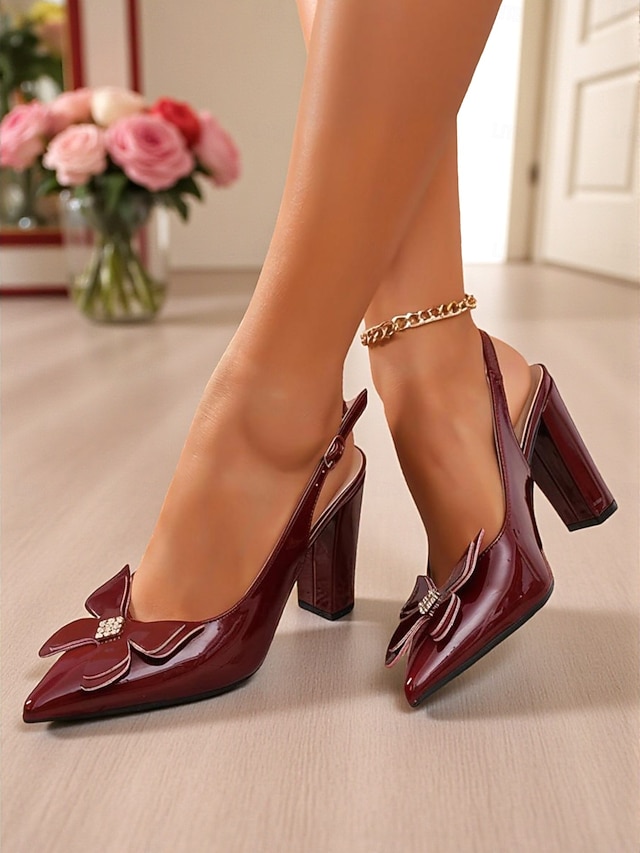 Γυναικεία μπορντό ψηλοτάκουνα πέδιλα με slingback και φιόγκο - γόβες με μυτερή μύτη για γραφείο, ραντεβού και ειδικές περιστάσεις #18464556
