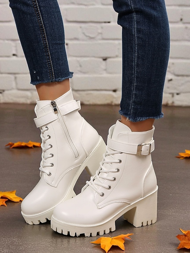 Γυναικείες λευκές μπότες με χοντρό τακούνι και δετά κορδόνια, κομψές μπότες μάχης με ψηλοτάκουνο και ρυθμιζόμενη αγκράφα, μοντέρνα υποδήματα για casual και υπαίθριες περιστάσεις. #18568934