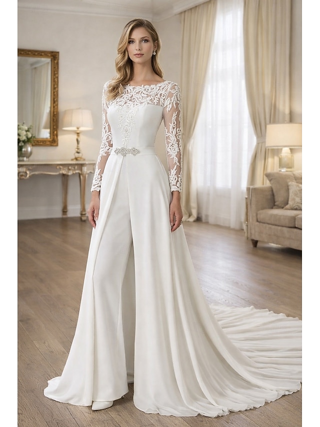 Ολόσωμη φόρμα Μακρύ Φορεματα για γαμο Απλός Καθημερινό Μακρυμάνικο Λαιμός ψευδαίσθησης Δαντέλα Ύφασμα Stretch με Ζωνάρια / Κορδέλες Κρυστάλλινη λεπτομέρεια Διακοσμητικά Επιράμματα #7983224