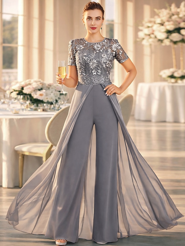 Παντελόνι Μέχρι τον αστράγαλο Φόρεμα Μητέρας της Νύφης Κοντομάνικο Με Κόσμημα Κομψό Επισκέπτης γάμου Επίσημο Βραδινό Stretch σιφόν με Δαντέλα Πλισέ