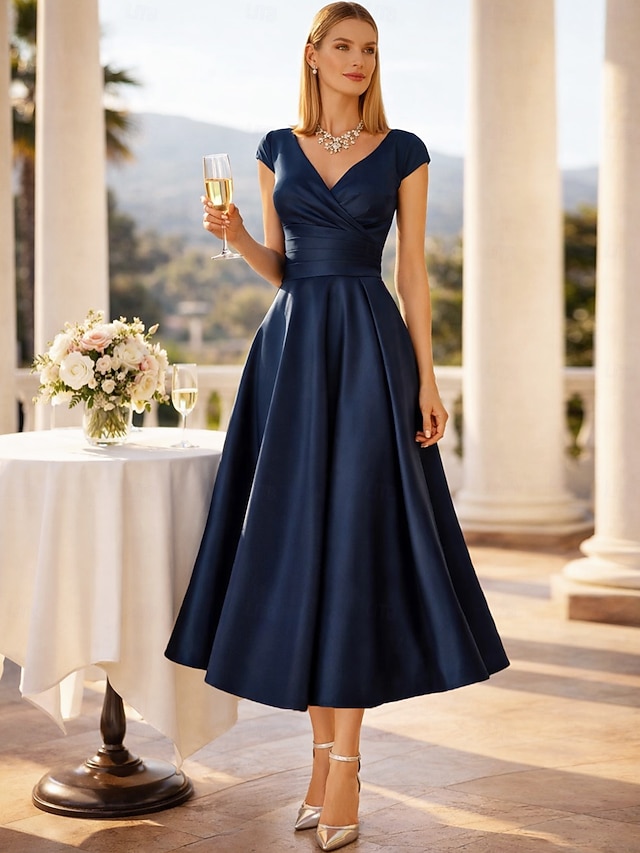 Γραμμή Α Κάτω από το γόνατο Κοκτέιλ Φορέματα Φορέματα για πάρτι Κομψό Μισό μανίκι Λαιμόκοψη V Επίσημο Επισκέπτης γάμου Σατέν με Τσέπη