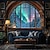 διαστημόπλοιο θέα στο φινιστρίνι διάστημα γαλαξίας σύμπαν δακτυλιωμένος πλανήτης νεφέλωμα αστέρια παγωμένο φεγγάρι τοπίο επιστημονικής φαντασίας παράθυρο τοίχου ταπισερί κρεμαστό για διακόσμηση