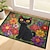 שטיח כניסה רקום דמוי עור חתול שחור ואלגנטי מוקף בשטיחת קבלת פנים צבעונית בגן פורח