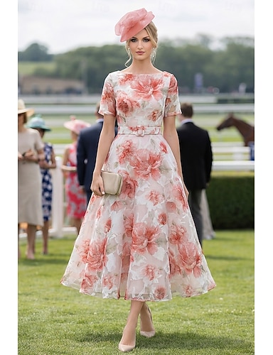 גזרת A באורך הקרסול שמלות קוקטייל שמלות אורח כלה אלגנטית שרוולים קצרים סירה רחב מסיבת חצר רשמי ג'אקרד עם הדפס פרחוני הדפס