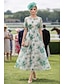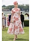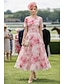 גזרת A באורך הקרסול שמלות קוקטייל אלגנטית וינטאג' פרחוני שרוולים קצרים צווארון V מסיבת חצר חתונה סאטן טול גב בדוגמת דרפה עם הדפס פרחוני פרח רקום קפלים