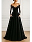 גזרת A עד הריצפה שמלות ערב שמלת נשף לבוש רשמי אלגנטית שמלה שחורה קטנה עשוי משי שרוול ארוך סירה מתחת לכתפיים חתונה רשמי שכמיות סאטן תחרה עם כיס