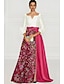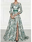 גזרת A עד הריצפה שמלות ערב שמלת נשף לבוש רשמי פיצול גבוה שרוול ארוך צווארון V רשמי סאטן עם הדפס פרחוני