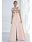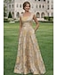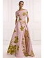 גזרת A עד הריצפה שמלות ערב שמלת נשף לבוש רשמי אלגנטית בלוק צבע שרוול 4\3 צווארון V חתונה רשמי שמפניה שמפניה של אם הכלה סאטן עם הדפס פרחוני פפיון(ים) שסע