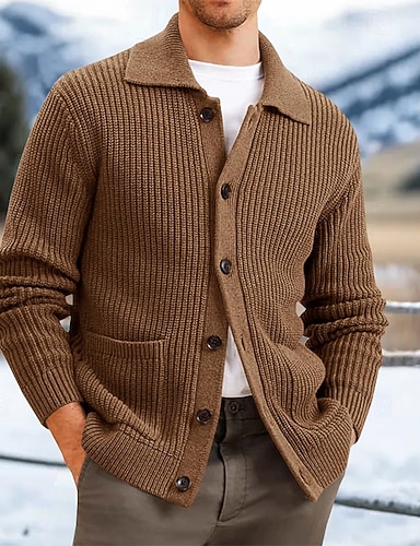 בגדי ריקוד גברים סוודר קרדיגן סוודר סרוג מצולע לִסְרוֹג רגיל כפתור למעלה כיסי צד צבע אחיד קולר אופנתי קלסי לבוש יומיומי פגישה (דייט) ביגוד אביב סתיו חורף שחור חום S M L
