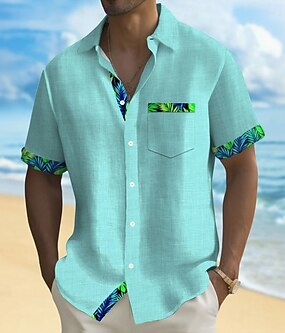 בגדי ריקוד גברים עלה דקל צמחים טרופיים חולצה חולצות הוואי חולצת אלוהה שרוולים קצרים הוואי חופשה חגים קיץ צווארון מתקפל הדפסת תלת מימד כיס אחד קדמי חולצה כמו פשתן פול כחול בהיר