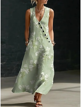 בגדי ריקוד נשים שמלת מקסי שמלת בוהו שמלת חולצה שמלת קיץ אלגנטית בוהמיה אתני חוף חגים מונח בצורה רפויה פרחוני גראפי ללא שרוולים צווארון V פול תלתן קיץ אביב