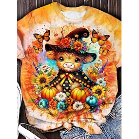 חג ליל כל הקדושים בגדי ריקוד נשים חולצה קצרה גראפי חיה פָּרָה סגנון חמוד מסוגנן יום יומי שרוולים קצרים צווארון עגול קצר צווארון עגול חולצות רגילות יומי דפוס שחור צהוב כתום קיץ סתיו