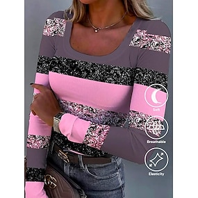 חולצת טי לנשים עם שרוולים ארוכים צוואר עגול טוניקה גרפית עם פסים בסיסיים טופים רגילים להדפסים יומיים סוף שבוע צבעים אדום כחול ירוק חאקי אפור סתיו וחורף לפני הסתיו