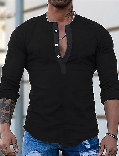 בגדי ריקוד גברים חולצה חולצת פשתן חולצת קיץ חולצת פשתן מכותנה חולצה ארוכת שרוולים אחיד רחוב ספורט שחור אודם תלתן שרוול ארוך הנלי קיץ & אביב ביגוד כפתור למטה