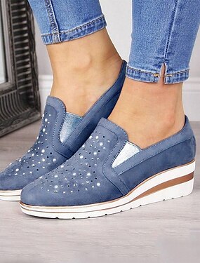 נעלי סניקרס כחולות להחליק על טריז לנשים - נעלי פלטפורמה מעוטרות באבן יהלומים יומיומיות לנוחות ואופנה יומיומית
