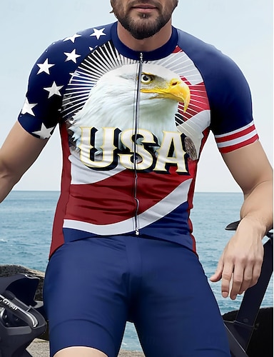 בגדי ריקוד גברים חולצת ג'רסי לרכיבה גראפי גיאומטרי יום העצמאות שרוולים קצרים אופנייים טי טי ג'רזי צמרות עם 3 כיסים אחוריים עמידות UV ייבוש מהיר רוכסן קדמי רצועות מחזירי אור ספורט שחור ביגוד