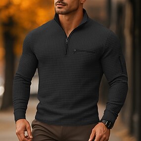 בגדי ריקוד גברים חולצות פולו וופל קזו'אל צווארון מתקפל שרוול ארוך אופנתי נוח צבע אחיד לרכוס כיס סתיו קיץ & אביב רגיל שחור לבן כחול נייבי כתום חולצות פולו וופל