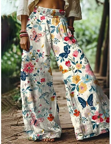 בגדי ריקוד נשים מכנסי כותנה פשתן רגל רחבה מכנסיים בוהמי יום יומי ארוך מותניים גבוהים פרחוני אלסטית מותניים מדפיס גזרה גבוהה נשימה רך מיקרו-אלסטי חופשה רחוב לבוש יומיומי לבן ורוד כחול פוקסיה אביב סתיו