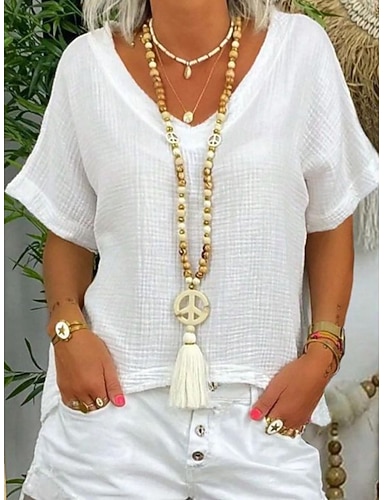 בגדי ריקוד נשים חולצות בהשראת פשתן חולצה קצרה אחיד אופנתי מודרני יום יומי שרוולים קצרים צווארון V חולצות רגילות יומי סוף שבוע לבן קיץ אביב