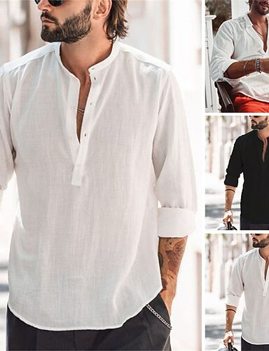 בגדי ריקוד גברים חולצה חולצת פשתן חולצת צווארון להקה חולצה פופ-אובר חולצת קיץ ביגוד חוף אחיד חופשה רחוב שחור לבן ירוק בהיר כחול בהיר שרוול ארוך עומד קיץ אביב ביגוד כפתור למטה
