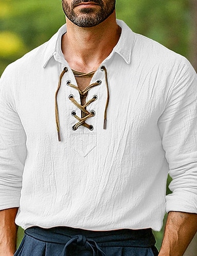 בגדי ריקוד גברים חולצה חולצת פשתן סגנון ויקינגי חולצת קיץ חולצת חוף צבע אחיד חופשה קזו'אל שחור לבן תלתן שרוול ארוך צווארון V קיץ אביב ביגוד שרוך