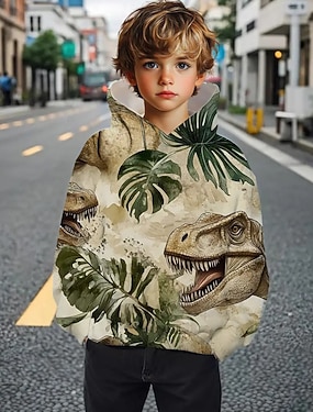 בנים תלת מימד דינוזאור קפוצ'ון שרוול ארוך אביב סתיו אופנתי סגנון רחוב ילדים 4-12 שנים עם קפוצ'ון בָּחוּץ קזו'אל יומי רגיל