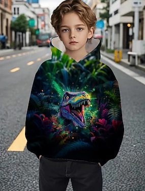 בנים תלת מימד חיה דינוזאור קפוצ'ון שרוול ארוך הדפסת תלת מימד סתיו חורף אופנתי מגניב ילדים 3-13 שנים בָּחוּץ יומי רגיל