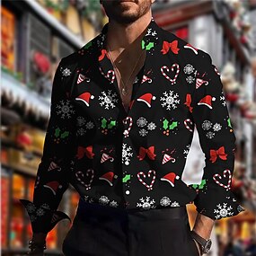 חג המולד גברים סצנת חג המולד חולצות מודפסות פתית שלג אופנה כפתור מזדמן עם שרוול ארוך מסיבת ערב יום יום סתיו חורף אביב & כפתור צווארון קיץ בהדפסת תלת מימד פוליאסטר שחור דק