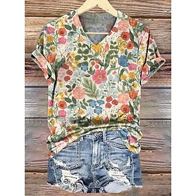בגדי ריקוד נשים חולצה פרח יומי מסוגנן בסיסי חצי שרוול צווארון V חולצות רגילות יומי חגים דפוס לבן פול בז' אביב סתיו