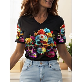 האלווין חולצת טי לנשים עם דפוס גולגלות פרחוני גרפי נוסטלגי אופנתי קלאסי שרוול קצר צווארון V טופים רגילים דפוס יומי שחור כתום אפור קיץ אביב