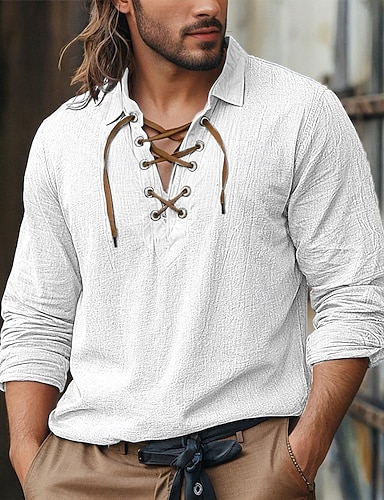 בגדי ריקוד גברים חולצה חולצת פשתן סגנון ויקינגי חולצת קיץ ביגוד חוף חולצת פיראטים צבע אחיד חופשה רחוב פול שרוול ארוך צווארון חולצה קיץ אביב ביגוד שרוך