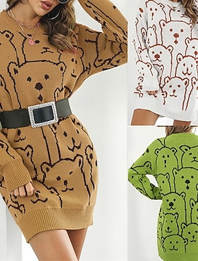 בגדי ריקוד נשים שמלת מיני שמלת סוודר שמלת סרוגה שמלת קז'ואל אופנתי בָּחוּץ מפלגה חגים רגיל חיה שרוול ארוך צווארון עגול קצר לבן תלתן חאקי סתיו חורף
