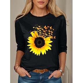 נשים טי שירט ארוכת שרוולים צווארון עגול טוניק גרפי פרחים פרפר בעיצוב עתיק אופנתי קלאסי טופס רגיל להדפס יומי בשחור לבן צהוב ורוד כחול סתיו לפני סתיו
