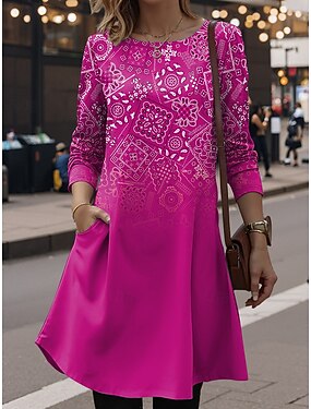 שמלות מידי לנשים בחיתוך V עם שרוולים ארוכים קפטן קל ועם גזרה רחבה באורך A סגנון בוהו גזרה רחבה גיאומטרי צבעים כחול פוקסיה כתום סתיו