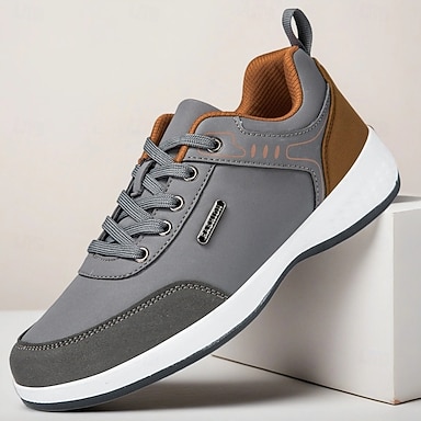 נעלי ספורט סריג אפורות לגברים עם טלאי דמוי עור נעלי הליכה קז'ואל קלות ונושמות, אידיאליות לטיולי אביב וללבוש יומיומי